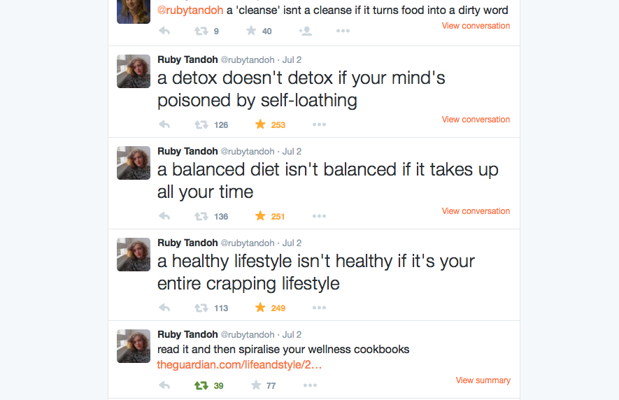 This Guardian article about the rise of the celebrity wellness blogger really moved me. And this twitter commentary from food writer Ruby Tandoh was spot on. “A detox isn’t a detox if your mind’s poisoned by self-loathing.”